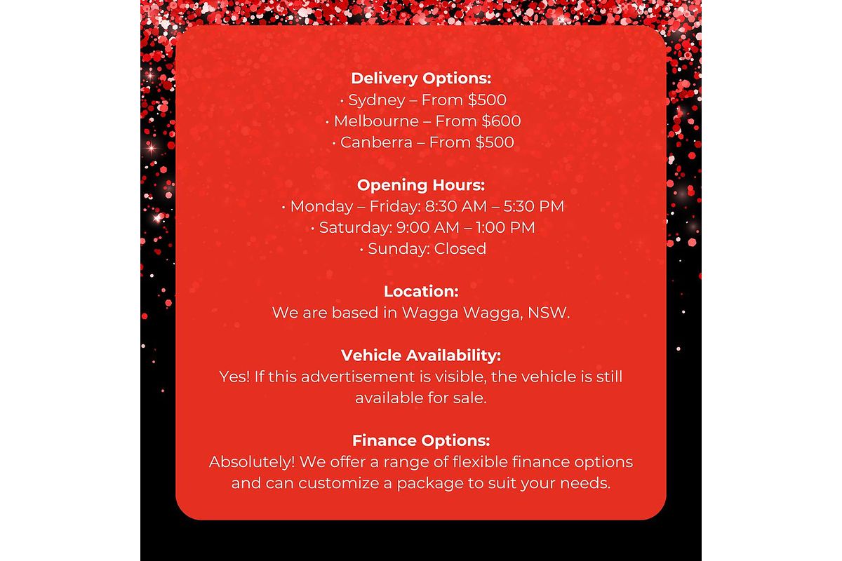 32 Dobney Ave, Wagga Wagga NSWAll advertisements on this site have been fully prepared by the sellers without any input from Countrycars. Countrycars has no means of verifying any aspects of the advertisements whether the existence, quality, title, encumbrance, state-of-repair or condition or value of the vehicle described by any seller or any representation made by any seller. Countrycars does not and cannot make any representation with regard to any goods advertised in any respect. Pricing applicable for location listed above unless otherwise indicated, Price may not include government charges, Please check with the Seller to confirm if any additional fees or charges apply. Dealer License number: 16726